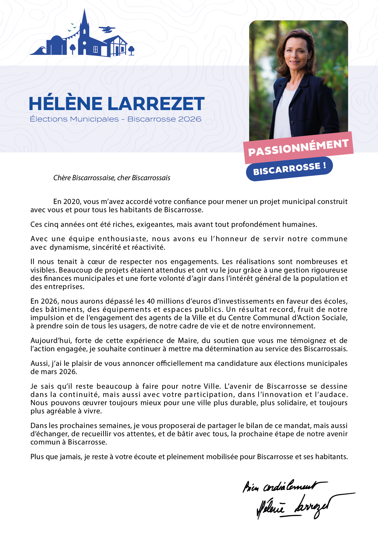 Partagez VOS IDÉES ! VOTRE AVIS COMPTE POUR CONTINUER DE CONSTRUIRE ENSEMBLE L’AVENIR DE BISCARROSSE ! Je participe ! NOS ENGAGEMENTS POUR BISCARROSSE Télécharger NOTRE PROGRAMME POUR BISCARROSSE Télécharger BILAN DE MANDAT Télécharger LETTRE DE CANDIDATURE Télécharger